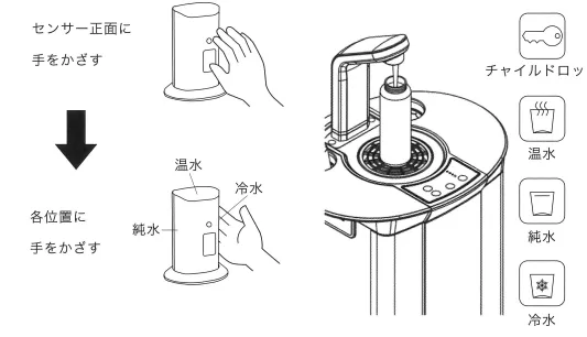 | 操作開始 | パネルで温/冷/炭酸水選択 | タッチレス操作可能 |