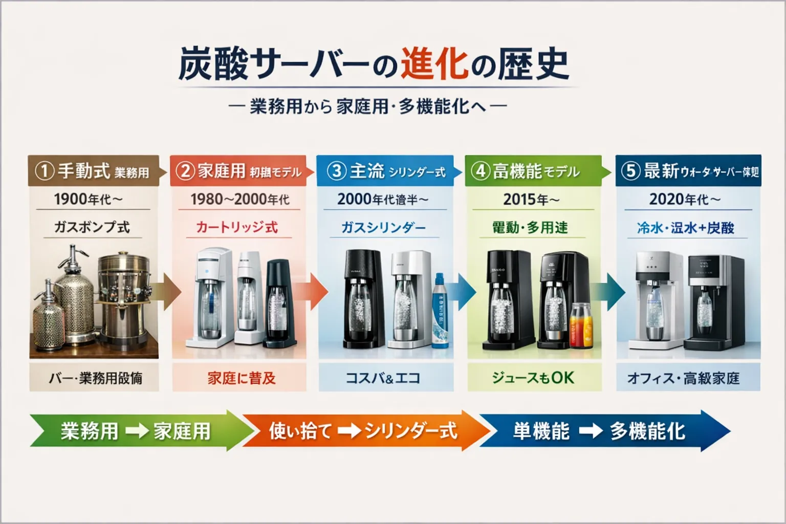 | 2010年代 | 業務用炭酸水サーバー水道直結 | 強炭酸生成 | 飲食店向け飲食店・バー |