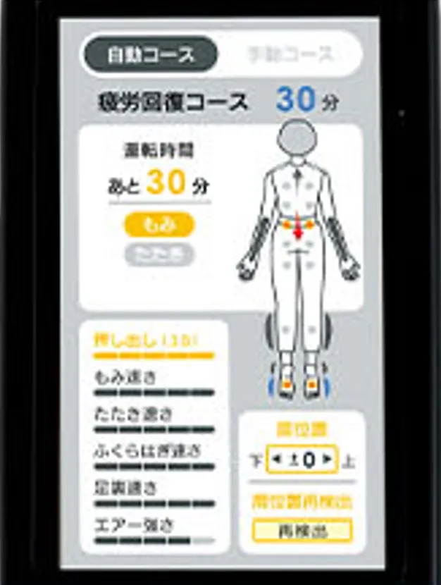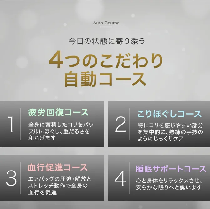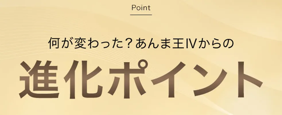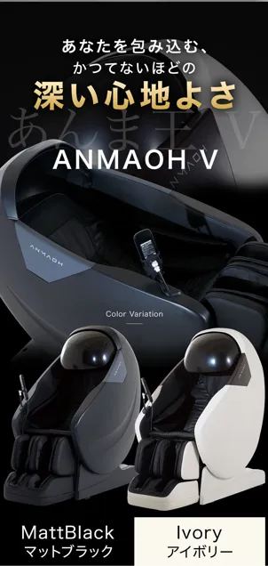 あんま王Ⅴ 2026/04/18 あんま王Ⅴ あなたを包み込む、 かつてないほどの 深い心地よさ ANMAOH V Japan quality HOL あなたを包み込む、 かつてないほどの深い心地よさ ANMAOH V Japan quality 3つの革新技術が織りなす未体験の心地よさ あんま王V 2026年集大成モデル 再起動 (リブースト)させる Reboost Massage 新発想 リブースト·マッサージ 革新01 FULL FACE HOOD 外部を遮断する 「フルフェイス·フード」 周囲の視線や騒音から遮断し、 まるで自分だけのプライベートな聖域。 これにより、より深い没入感と 精神的なリフレッシュを実現します。 革新02 深化する浮遊体験 背もたれ·座面·オットマンが連動し、 身体に負担が少ない「無重力」姿勢へ。 全身の圧力が分散され、筋肉の緊張が和らぐことで、 マッサージの心地よさをより深く体感いただけます。 フルフェイスフードが創り出す静かな空間と 「浮遊ポジション」がもたらす、身体がふわっと軽くなる感覚をぜひ体験ください。 熟練の手技を再現する 3D揉みメカ もみ玉にはシリコンを採用し、人の手で揉む感触を再現。 3D揉みメカにより、まるで熟練の手技のように、 もみ玉が立体的に前後稼働。より細かく、強く、 そして優しく、繊細で多様なマッサージを可能にし、 しつこいコリをじっくりと揉みほぐします。 3D揉みメ力 より細かく、強く、そして優しく、繊細で多様なマッサージ を可能にし、しつこいコリをじっくりと揉みほぐします。 ふくらはぎ ローラー新搭載 大型エアバッグとの組み合わ せで、ふくらはぎ全体をしっか り揉みほぐし、足の疲れを繊 細にケアします。 腕エアバッグ もみ範囲を33cmから50cmに拡大。手の平から前腕全体を包み込む広範囲のエアバッグで、腕全体をつかむように揉みほぐします。 4つの自動コース さらに磨きをかけた4つの自動コースを新搭載。 明確に特徴の異なるコースで、 満足度の高いマッサージを提供します。 手動調整機能 細かな設定が可能に。 強さ、スピード、もみ玉の位置など、 あなたの今日の気分や身体の状態に合わせて、 マッサージをパーソナライズできます。 細部までこだわり 抜かれたデザイン 流れるような曲線、光を巧みに捉える立体的なフォルムは、空間の価値を高め、見る者の感性を刺激します。 強度アップ リモコンスタンド 腕ユニットの内側に組み込まれたリモコンスタンドは、美観の向上をはじめ、省スペース化とリモコンスタンドの破損リスク低減を実現。 音声アナウンス 機能 最上級の「おもてなし」を「声」でも提供。心地よい音声がリラックス体験をより深く、質の高いものへと昇華させます。 日本語、英語、中国語、韓国語の4か国語対応。