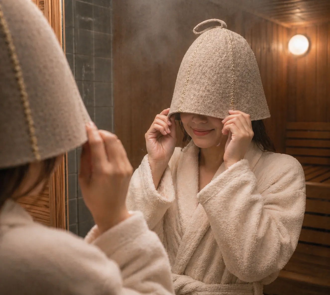 サウナハットを正しく着用することで、より深い「整い」を実感できます。着用のコツは、ハットを頭全体にしっかりかぶり、耳まで覆うことです。これにより、頭部全体を均等に熱から守り、のぼせやすさを軽減できます。