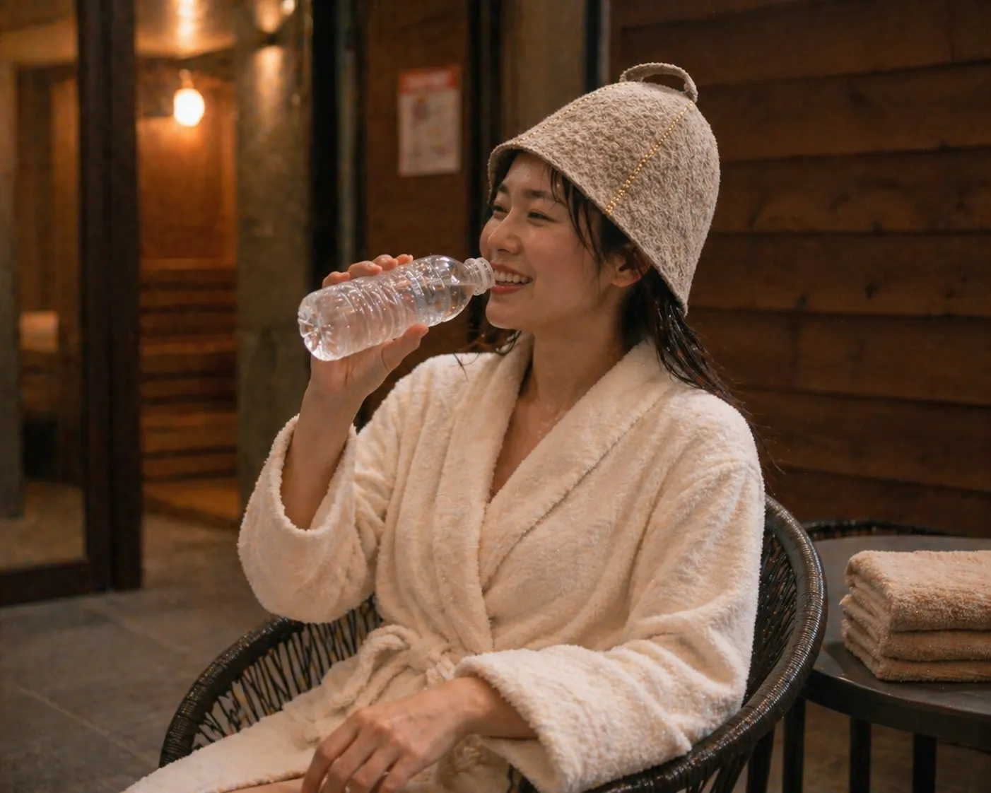 具体的には、サウナに入る前にコップ一杯の水を飲み、1セット終了ごとに少量ずつ補給するのが効果的です。ミネラルウォーターや経口補水液が推奨されますが、糖分やカフェインを含む飲料は控えめにしましょう。サウナハットを着用している場合は発汗量が増えることもあるため、より意識的な水分補給が求められます。